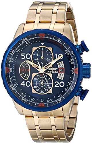 -. Binding : Watch -. Brand : Invicta -. Color : blue -. Department : mens -. EAN : 0886678236442 -. Feature : Chronograph functions with 60 second, 60 minute and 1/10 of a second sub dials; date window at 3:00 / Blue dial with gold tone and white hands and white Arabic numerals; luminous; blue ion-plated stainless steel bezel; tachymeter; flame fusion crystal; blue ion-plated stainless steel case with 18k gold ion-plated stainless steel cover; 18k gold ion-plated stainless steel bracelet / Japanese-quartz movement / Case diameter: 48mm / Water resistant to 330 feet -. IsAdultProduct : 0 -. Label : Invicta -. Manufacturer : Invicta -. Model : 19173 -. MPN : 19173 -. PackageQuantity : 1 -. PartNumber : 19173 -. ProductGroup : Watch -. ProductTypeName : WATCH -. Publisher : Invicta -. Studio : Invicta -. Title : Invicta Men's 19173 Aviator Analog Display Japanese Quartz Gold Watch -. UPC : 886678236442
