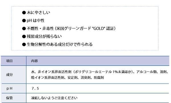 | 成分 | 水、非イオン系界面活性剤(ポリグリコールエーテル1%未満ほか)、アルコール類、溶剤、陰イオン系界面活性剤、安定剤、防腐剤(ベンゾチアゾロン、メチルイソチアゾリノン)、消臭剤 |