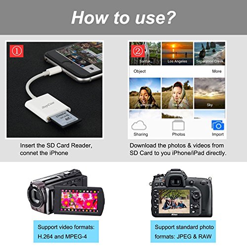 The Lightning to SD Card Camera Reader supports standard photo formats, including JPEG and RAW, along with SD and HD video formats, including H.264 and MPEG-4.