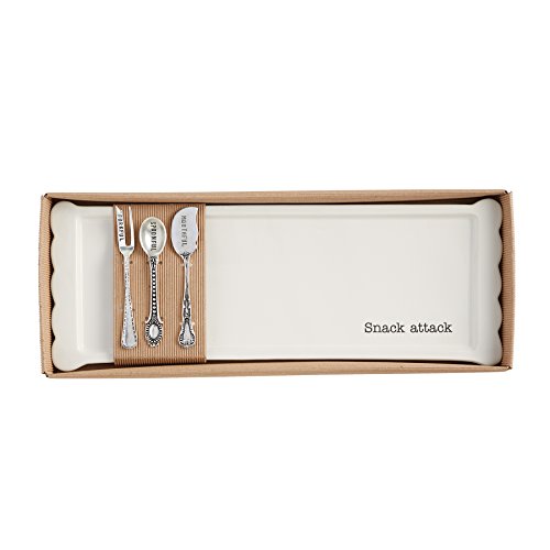 Product Description4-piece set. Scalloped ceramic "Snack attack" stamped hostess tray arrives with "FORKFUL,", "SPOONFUL" and "MOUTHFUL" silver plate utensils.0
