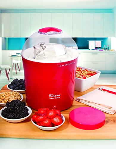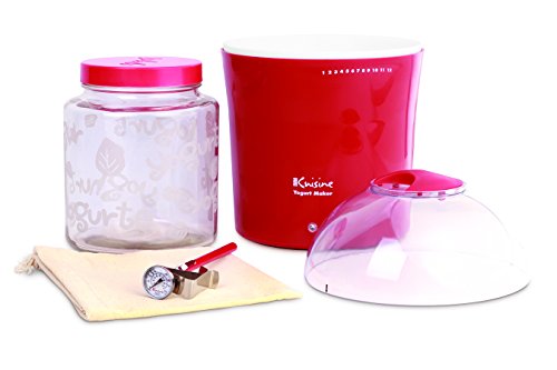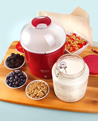 With the Euro Cuisine Yogurt and Greek Yogurt Maker with a 2QT Glass Jar, you can make home-made all natural, rich, and creamy yogurts with any kind of milk within 6 to 8hours. The Euro Cuisine Yogurt Maker with Glass Jar allows you to control sweetness, ingredients, and fat content. The unit is very economical, as you can prepare up to 2 quarts of yogurt at a time. Timer on the side of the unit marks time as to when yogurt will be finished cooking. The Yogurt Maker kit includes a 2QT Glass jar with lid, a stainless steel thermometer, and a specially designed cotton bag for making Greek Yogurt /cheese. The cotton bag has an easy-to-fill opening and a cord, which makes it simple to close the bag and hang it in order to make your Greek Yogurt /cheese.Feature