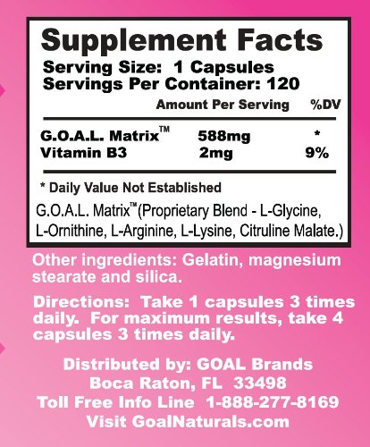 NEW Easy to Swallow Capsule formula! G.O.A.L. MATRIX Amino Acids Complex Pills for Women by GOAL Naturals is Fortified with GOAL Amino Acids Complex - L-Glycine L-Ornithine L-Arginine L-Lysine. Best Anti-Aging Supplement for Women will help you Decrease fat, while increasing lean muscle. Power up your brain, sleep better, Tone and improve overall physical and mental well being. Improve the look and feel of your skin hair and nails. GOAL Matrix Amino Acid Complex for women also a powerful high performance NO Nitric Oxide Booster Formula.