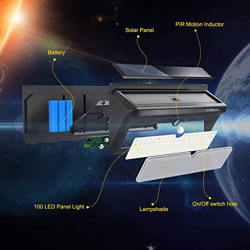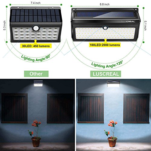 - 【Brighter 100 LED Lights】: Compared with the most similar solar lights outdoor on the market, this outdoor solar light with 100 LED solar-powered bulbs is much brighter and softer, Unique lighting emission provides excellent illumination of up to 2000 lumens.