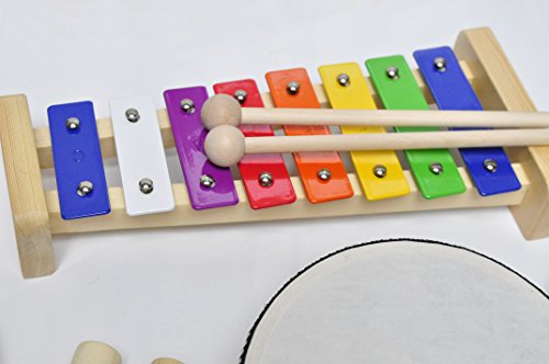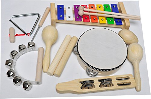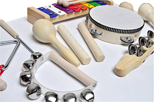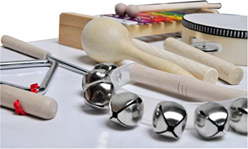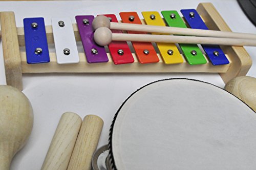 Unbekannt Clifton Kinder Percussion Set aus Holz 9 teilig inkl. Handtrommel, Schellenbaum, Maracas, Metallophon, Triangel, Kastagnetten, Klangholzer, Ei Shaker, Handrassel, Kinderlieder CD