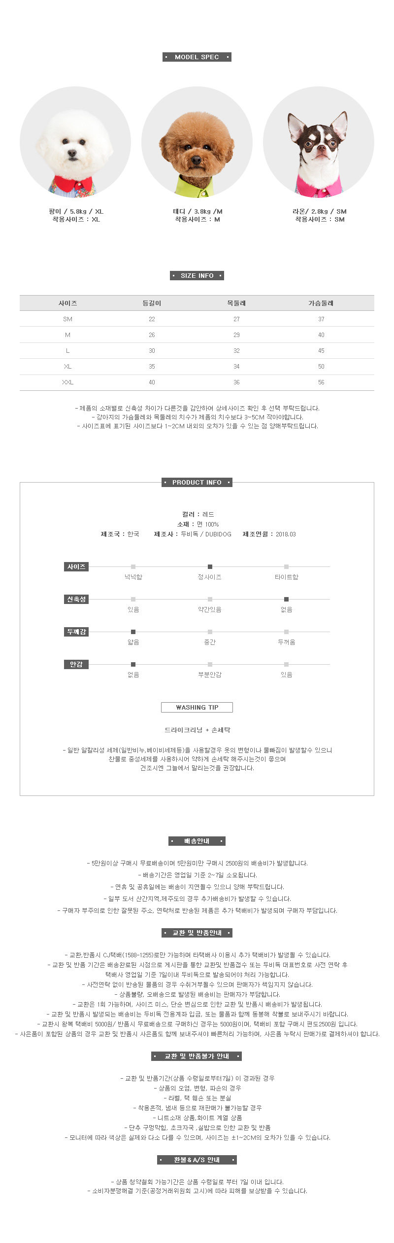 | 18s/s 두비독만의 감성이 느껴지는 플라워패턴s/t 셔츠 레드색상을 소개합니다:) 플라워패턴과 스트라이프의 조합으로 시즌무드를 어필하고 시선을 압도하는 세련된 셔츠 입니다. 기존의 셔츠에서는 볼수없던 독특한 디자인과 진주 버튼의 고급스러운 디테일이 볼수록 매력적인 아이템으로 밝고 경쾌한 이미지까지 연출할수있어 이번시즌 소장하시길 추천드려요! 아가보다 더 연약한 댕댕이들의 피부를 고려해 면100% 소재를 사용하고 카라와 소매부분에 사용된 원단 또한 바이오워싱처리되어 먼지가 발생하지 않아 피부가 예민한 아가들에게도 적합합니다. 100%국내생산 두비독만의 입체패턴으로 두비독만의 차별화된 스타일을 즐겨보세요:) |