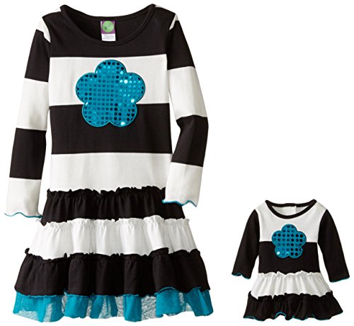 Dollie & Me Big Girls' Knit Stripe Dress With Tulle Hem and Sequin Flower Applique, Black/White, 14