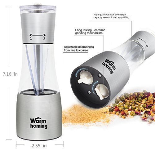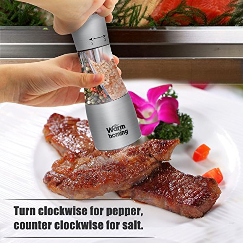 - SMOOTHLY AND QUICKLY: The pure alloy rotating rods and stainless steel grinding mechanism allow you effortlessly to make perfect sized salt or pepper grain to fit your dish. The Warmhoming salt and pepper grinder set handle let you whirl it easily and smoothly, expect to use this as an everyday tool in the kitchen.
