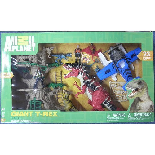 -. Feature : Get set for a grand Dino expedition with this super Giant-sized T-Rex and Accessories Playset from Animal Planet. / Giant T-Rex is over 12" tall, and 16" long from head to tail! / Realistic details, fully jointed, and lights and sounds when you press down on T-Rex head (eyes light up and roaring sounds) / 23-piece set with Giant T-Rex, Tree House with vines, ladder, and gate, Bi-plane airplane that fits one action figure, two smaller dinos, pterodactyl, fossil bones, 2 action figure men and rescue equipment accessories., / Ages 3+, Requires 2AA batteries with demo batteries included.