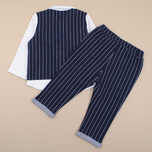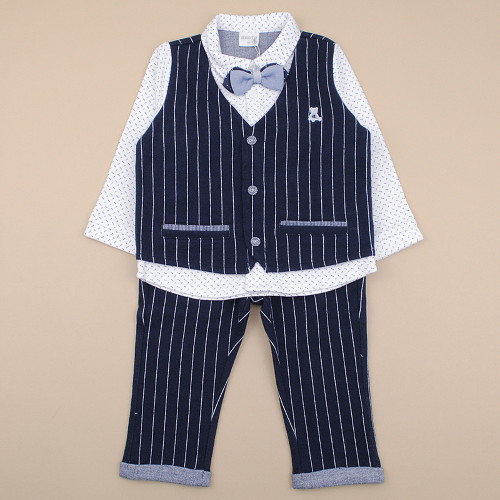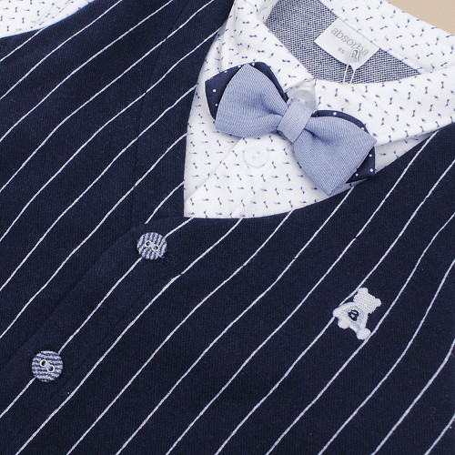 깔끔한 스트라이프 조끼에다 잔잔한 패턴으로 포인트를 주어 단조롭지 않고 트랜디하면서 편안한 제품입니다 조끼와 셔츠는 붙어있는 스타일로 백일아이부터 편하게 입기 좋으며 선물용으로도 매우 좋은 상품입니다.보타이는 탈 부착이 가능합니다.