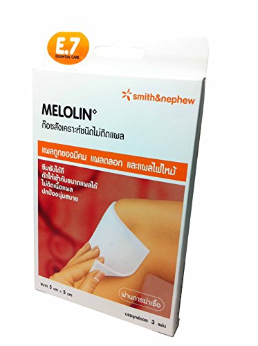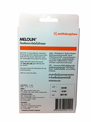 -. Binding : Health and Beauty -. Brand : Melolin -. EAN : 0801742077479 -. Feature : 6 packs of Melolin 5 x 5 cm Wound Dressing Pad (3pcs/pack) / low adherent pad medical proven, absorbent dressing pad which absorbs excess fluid away from the wound. This pads are comfortable and cushion the wound. / Apply this pad to the wound. The shiny film side goes directly onto the wound. / Store in a cool, dry place. / "free!! sticker Thai_product, souvenir from Thai_product.,High Quality & Services by Thai_product. " -. IsAdultProduct : 0 -. Label : Thailand -. Manufacturer : Thailand -. ProductGroup : Health and Beauty -. ProductTypeName : HEALTH_PERSONAL_CARE -. Publisher : Thailand -. Size : 5 X 5 cm -. Studio : Thailand -. Title : 6 Packs of Melolin 5 X 5 Cm Wound Dressing Pad (3pcs/pack) -. UPC : 801742077479
