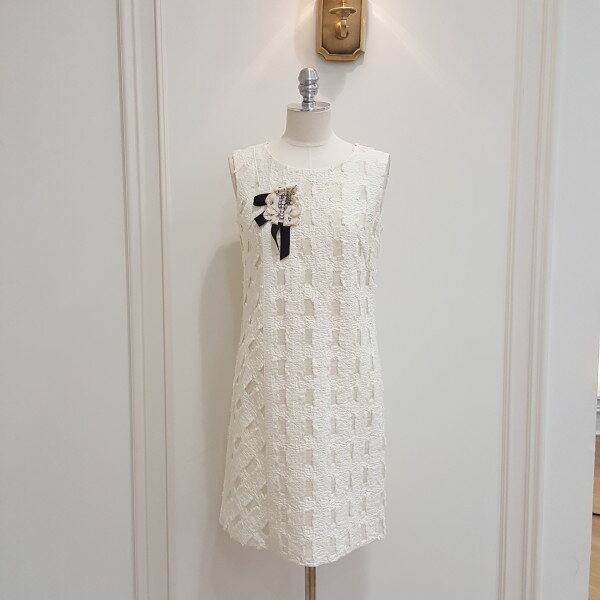세미A라인 민소매 윈도우 자가드 원피스. 절개선 좌우로 결방향을 다르게 써서 자가드 모양이 깨지는 것이 포인트. 상동에 옵션 브롯치 달아서 연출해주세요