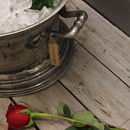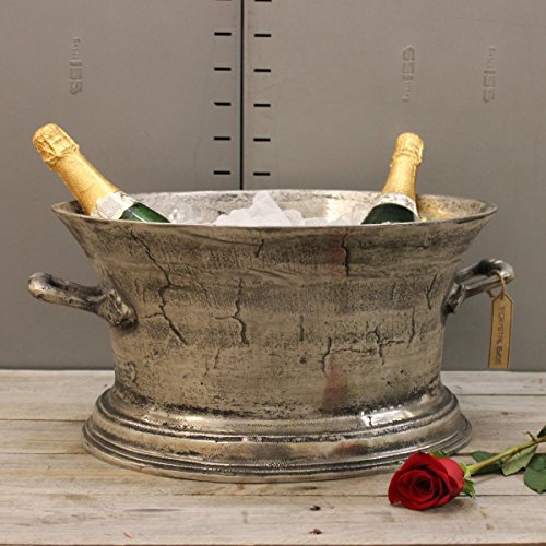 -. Feature : Set the perfect mood for your event with this vintage style champagne bath. Keep your bubbly close to hand and add a touch glamour to your occassion. Perfect for classy bars, restaurants, and hotels. / Solidly constructed from Aluminium with a vintage distressed finish. / Material: Aluminium Finish: Distressed silver / Shape: Oval Assembly: Fully assembled / Dimensions: L: 44cm x W: 37cm x H: 23.5cm Internal Depth: 18cm Weight: 5.7Kg
