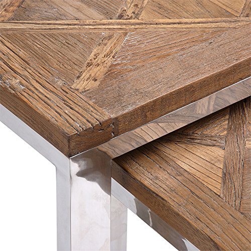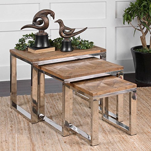 -. Brand : Kathy Kuo Home -. Color : Brown -. Feature : Small: 15 inches high x 15 inches wide x 15 inches deep; Medium: 17 inches high x 22 inches wide x 19 inches deep; Large: 18 inches high x 20 inches wide x 22 inches deep / Constructed from wood and stainless steel / Polished stainless steel and natural reclaimed wood finishes -. Label : Kathy Kuo Home -. Manufacturer : Kathy Kuo Home -. MPN : UTM-24416 -. PartNumber : UTM-24416 -. ProductGroup : Furniture -. ProductTypeName : HOME_FURNITURE_AND_DECOR -. Publisher : Kathy Kuo Home -. Studio : Kathy Kuo Home -. Title : Haverley Rustic Recycled Elm Steel Nesting Tables - Set of 3