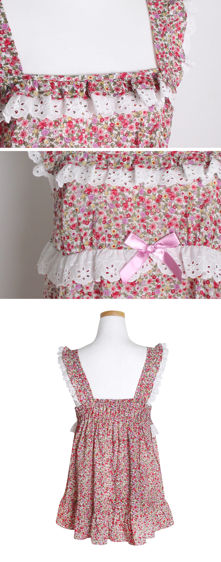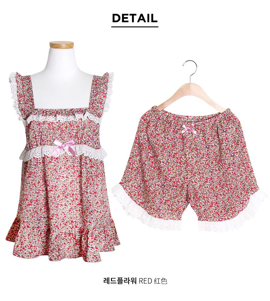‘화사한 컬러의 플라워 프린팅이 얼굴 빛까지 환하게 만들어 주는 원단이에요.. 깊게 내어준 네크 라인과 어깨끈에서 바스트로 이어진 레이스 장식으로 섹시러블리가 조화롭게 어우러졌습니다.. 패턴에 바스트 부분을 살짝 잡아주어 좀 더 볼륨감 있게 연출할 수 있도록 디자인 하였어요.. 뒷 부분에도 밴딩을 넣어주어 체형에 맞게 편안하게 착용할 수 있습니다.. 팬츠는 3부 기장으로 짧게 제작하여 더 활동성 있고 발랄하게 입을 수 있도록 제작하였답니다.. 면70% 레이온30% 혼방으로 제작한 소재로 더운 여름 시원하게 입을 수 있는 원단이랍니다.. 통풍이 우수하고, 여름에 입기 탁월한 소재로 가볍고 편안하게 입기 좋아요.. 100%국내 제작으로 소재, 봉제, 디자인면에 퀄리티가 높고, 매력 있는 프린팅과 디자인으로 소장가치가 높습니다 .
