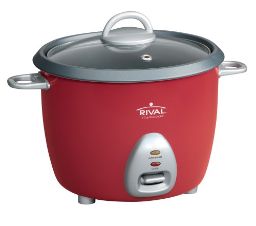 A complete, healthy, fat-free meal can easily be prepared in this electric rice cooker. The nonstick removable inner pot produces up to 6 cups of cooked rice, while the steaming basket holds enough vegetables or shrimp for one or two hungry people. Simple to operate, the cooker features just one switch and two settings, cook and keep warm. During cooking, a red light is illuminated; when cooking is complete, the switch automatically reverts to the keep-warm setting and a yellow light comes on. Moisture and nutrients are sent back into the cooker by the domed glass lid, which also allows for easy viewing. After cooking, the rice should be allowed to sit for about five to seven minutes before removing the lid. Accessories include a measuring cup and a plastic rice paddle for stirring and serving the rice. The cup, paddle, pot, and steamer all should be washed by hand in hot, soapy water after each use. The rice cooker, including its stay-cool side loop handles, measures approximately 11-1/2 by 8-1/2 by 10 inches.Feature