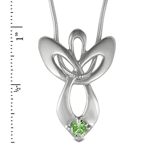 A great gift for the August angel in your life! With a body and wings of ribbon-like sterling silver, this graceful guardian angel is the perfect gift for daughters, mothers and other special women. The concave design of the back of the pendant is reminiscent of a worry stone, offering comfort not only in its symbolism but in its design as well. A luscious light green peridot Swarovski crystal birthstone accents the angel pendant at its base. Our jewelry is proudly made in America with US and imported parts. We do our part for the environment by crafting our jewelry from recycled .925 sterling silver. Crystal is sourced from a certified 5-Star SWAROVSKI® ELEMENTS dealer, see our Detailed Seller Information page for more information.Feature
