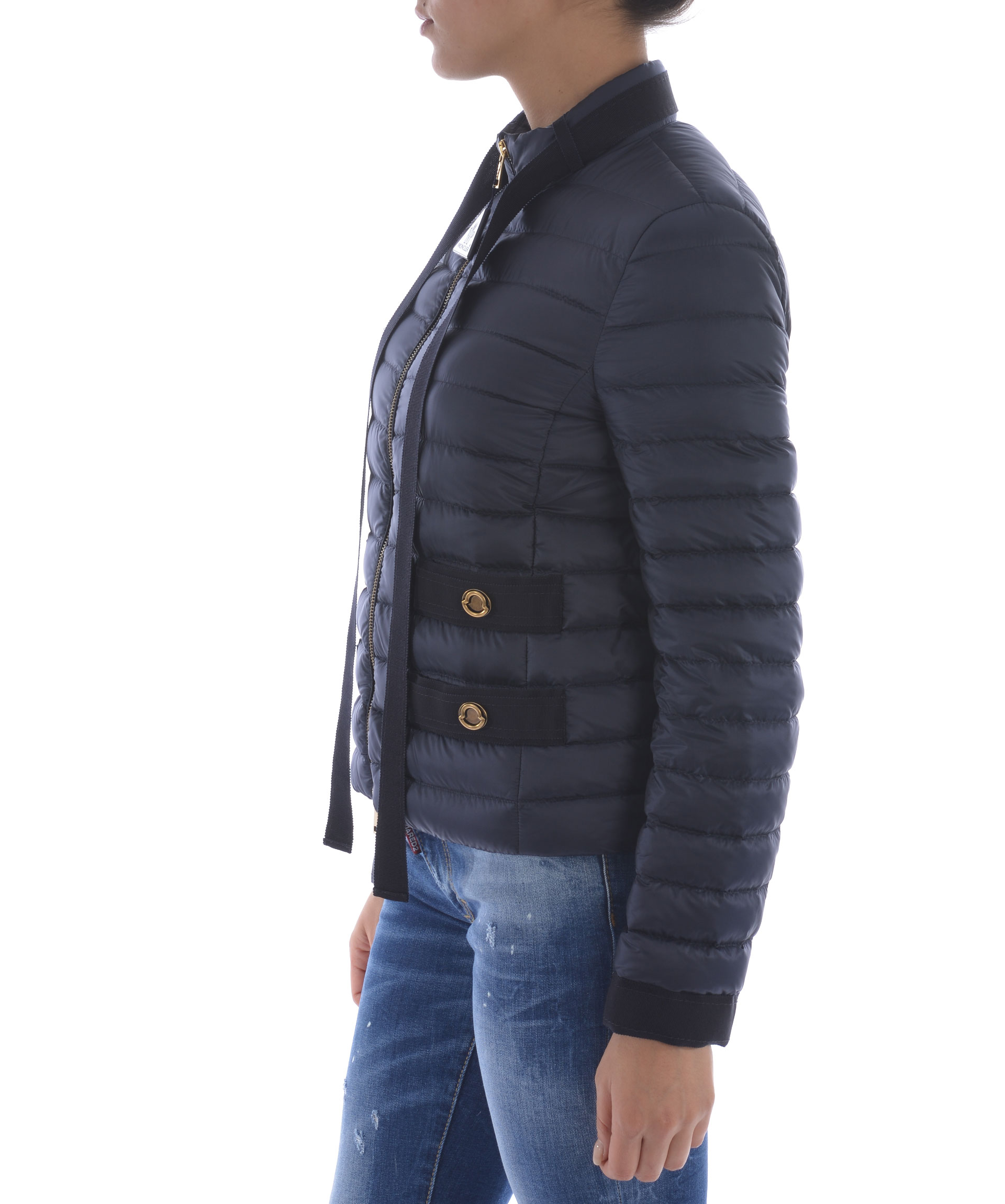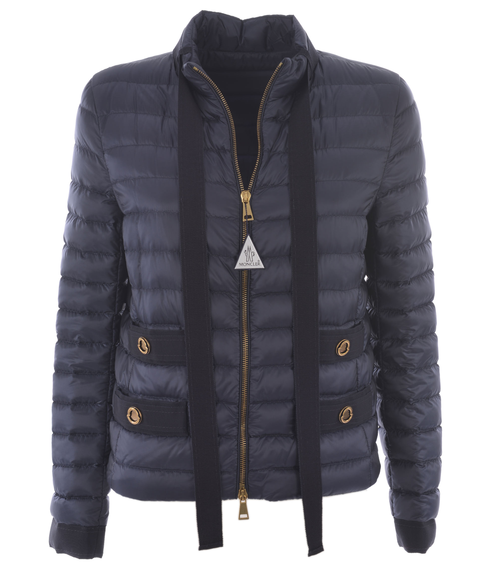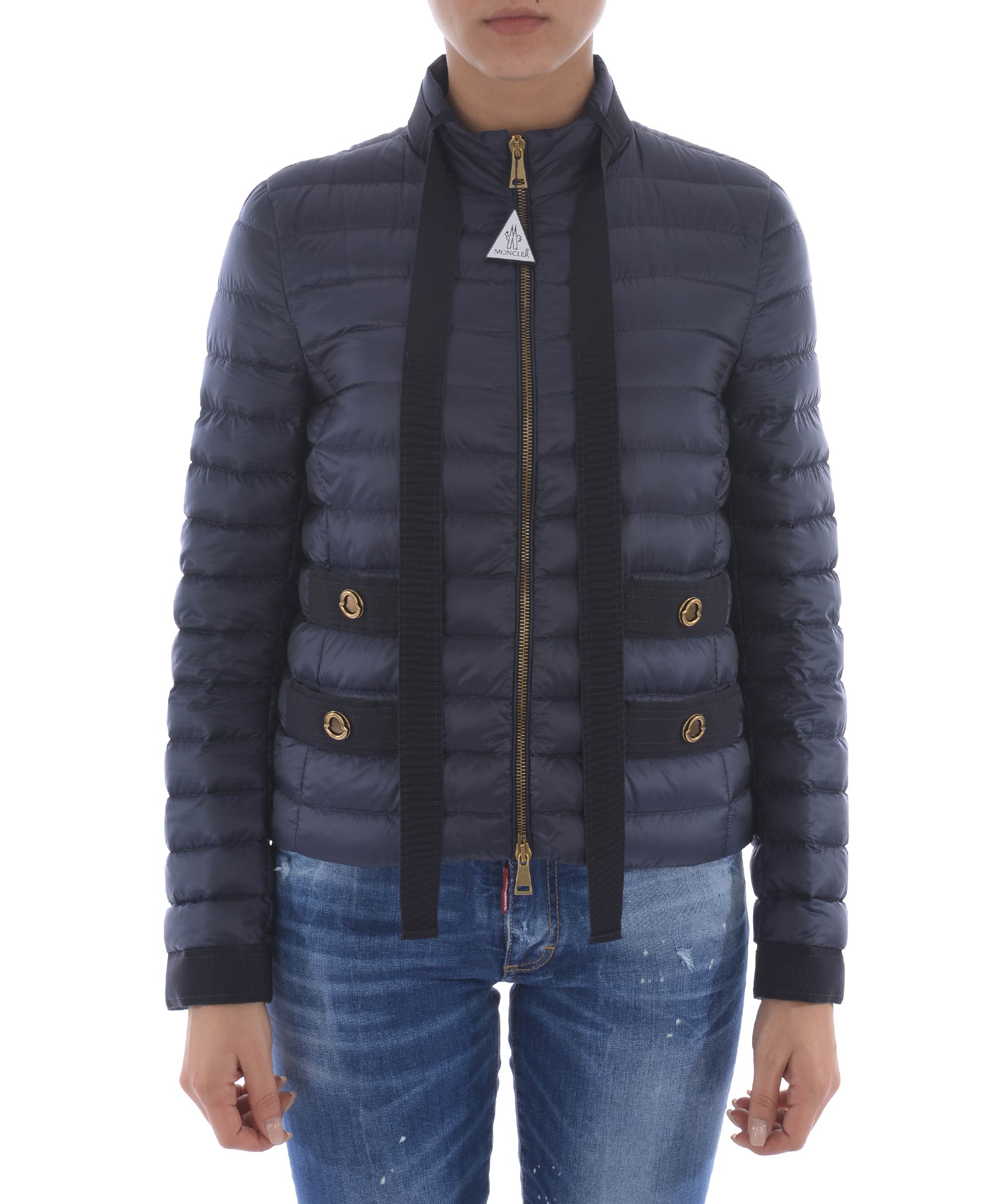 Pavottine Down Jacket from Moncler: Dark Blue Pavottine Down Jacket with front zip closure, high collar and grosgrain band tie