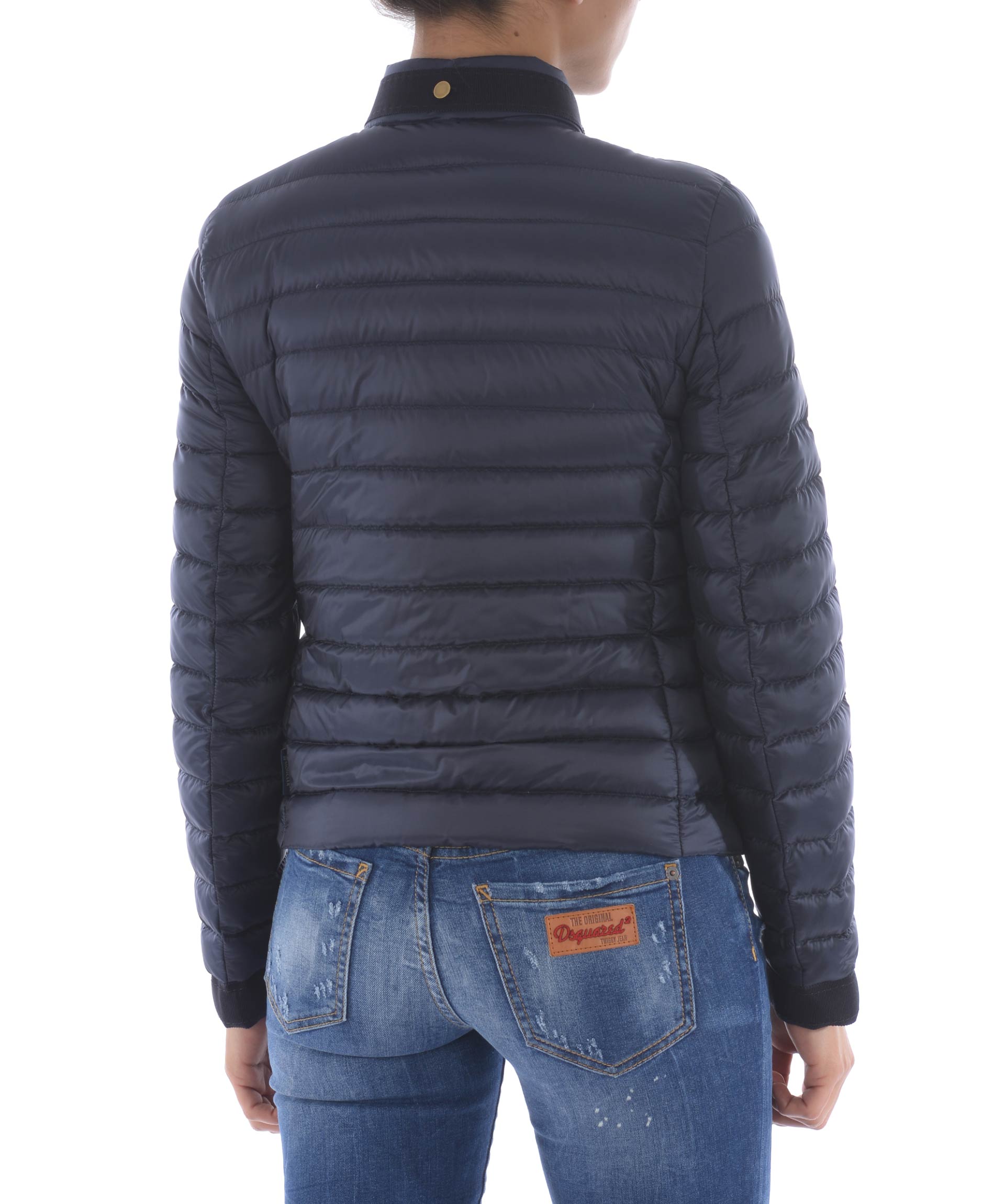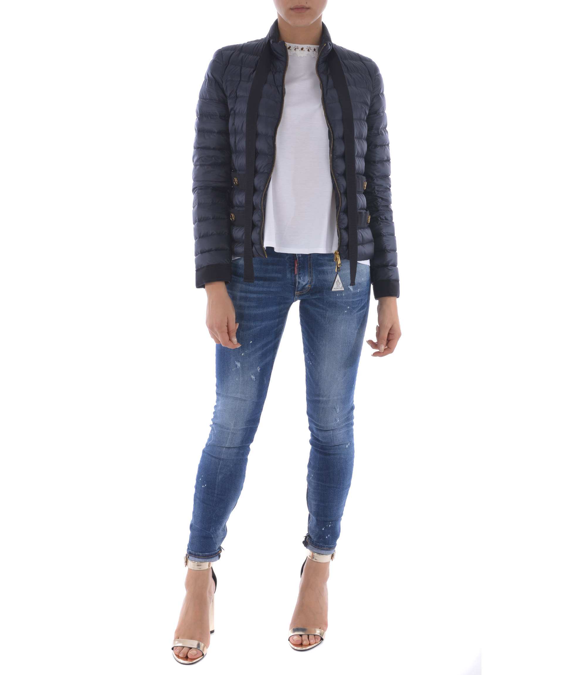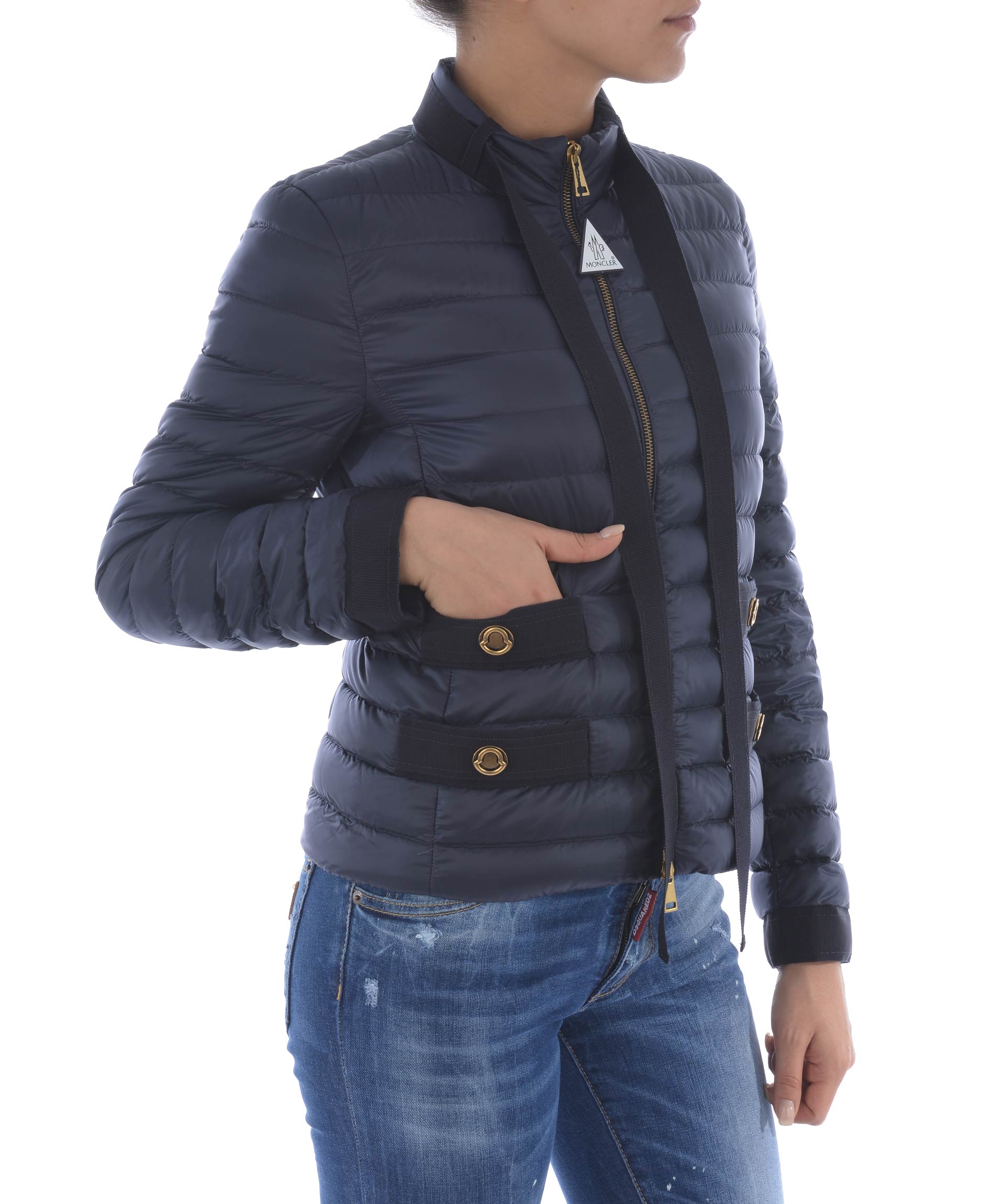Pavottine Down Jacket from Moncler: Dark Blue Pavottine Down Jacket with front zip closure, high collar and grosgrain band tie