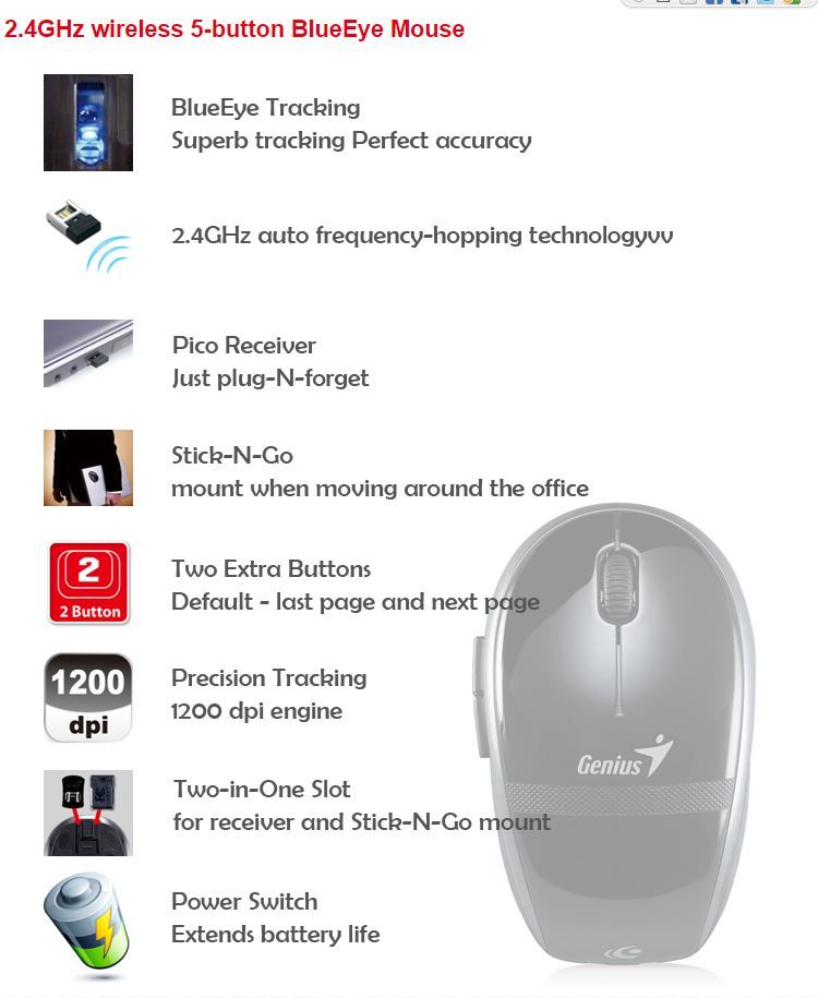 • 1 x Genius Traveler 8000 Wireless 5-Button BlueEye Mouse - Black