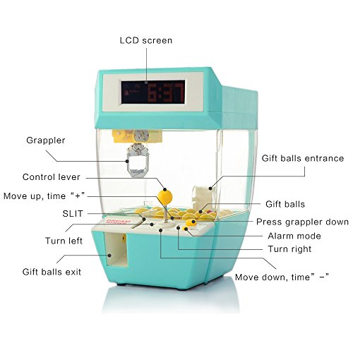 Features: *Carnival Style Gaming Machine *Perfect for catch small Candy or Toys *Claw Grabber Unit is Fully Motorised *Plays Music while Game is in Progress *Operates on Coins (Included) or Normal Coins *Great Gift Idea for Friends & Family! *Suitable for Ages 4+ *English User Manual Included Introductions: 1.Time Setting(The detailed time setting step, please refer to the use manual) 2.Alarm Clock Setting(The detailed alarm clock setting step, please refer to the use manual) 3.Alarm Clock Mode(Press the 'MODE' button to set NORMAL or HARD for alarm mode) a.Normal mode: Need to put a coin and move the control level to set catch the ball. The alarm clock will be turned off whether you can catch the gift ball or not. b.Hard mode: Need to put a coin and move the control level to set catch the ball. The alarm clock will be turned off when you catch the ball. If not, the alarm clock will be alaways ring if not stopped. 4.Game Mode Press any button to make the light on LCD display is on. Now you can put a coin in the slit, and move the control lever to set the grappler in the right position, and then press "DOWN" button to catch the gift ball. After that, no need any action, the grappler will carry the gift ball and deliver to the gift balls exit. The alarm clock will play different sound whether you catch the gift ball or not. Size:L*W*H: 4.9*4.9*7.6 inches Weight:1.1lbs Warning: 1.Please kindly change new batteries when you play the catcher and find the time display is turning to 12:00. 2.This toy may be not work if you use in wrong way, if you have any problem, please feel free to contact the seller. 3.Please refer to the use manual carefully. 4.Coin (Include 4): Any coin about dia. 0.75in can use. One coin can play once time, and take it out to play again.Feature