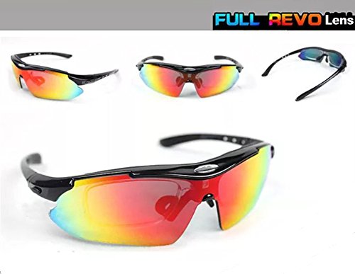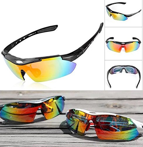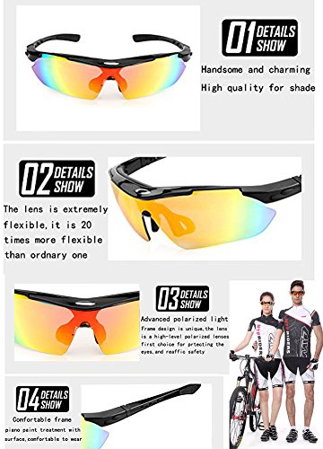 Sport Sunglasses are designed for driving, cycling and all Outdoor Activities.Lens made of shatterproof unbreakable PC material are durable enough for long time using.Only the Main Black Lens are Polarized Lens against strong sunlight, the other 4 lenses are colored sunglasses for different environmental condition.