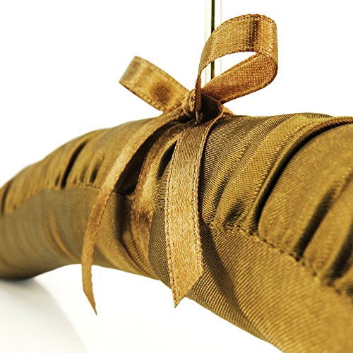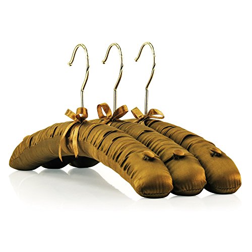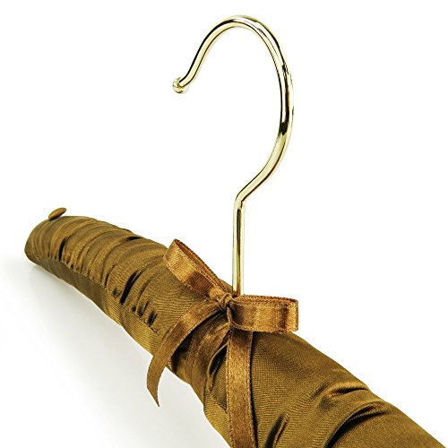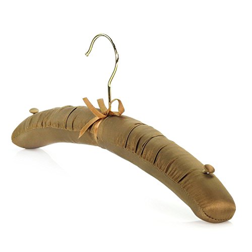-. Feature : Pack of 5 premium quality caramel brown satin padded coat hangers. / For tops, dresses, trousers & skirts, bridal & lingerie etc. / Soft satin cushioning with strengthened inner wooden bar. Pretty ribbon trim at base of gilt hook. / Matching fabric covered shoulder buttons to secure straps, loops etc. / Lovely gift - packed in sealed clear film. Size: 41cm (16") approx.