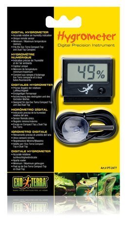 -. Feature : Provides accurate measurement of air-humidity / Equipped with Minimum / Maximum temperature memory / Unique remote sensor / Ability to be mounted 3 ways: Velcro, with a screw, or slid on / Fits the Exo Terra Compact Top and Dual Top Canopies