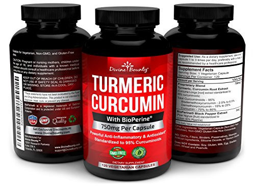 -. Binding : Health and Beauty -. Brand : Divine Bounty -. EAN : 0738759842199 -. Feature : 50% MORE POTENT, BEST VALUE - Our Turmeric Curcumin C3 Complex with BioPerine formula is the most potent on the market. A highly POTENT 750mg of Curcumin per capsule (most other brands are only 500mg per capsule). / HIGHEST QUALITY INGREDIENTS - Not only is our tumeric curcumin supplement more potent, we use patented Curcumin C3 Complex. It is then combined with the patented black pepper extract BioPerine (5mg) for increased absorption and bioavailability. Curcumin with black pepper is essential in good curcumin supplements. We only use the best, because you deserve the best! / STANDARDIZED 95% CURCUMINOIDS - Normal turmeric only contains 2-6% curcumin. Yet studies show most of the health benefits come from the curcumin found inside. Beware of 'turmeric curcumin' formulas that simply contain a high dose of regular turmeric that only contain 2-6% curcumin. We use Curcumin C3 Complex because it's standardized to 95% curcuminoids, which means you're getting a highly potent dose of concentrated curcumin (not just regular turmeric). / FEEL THE DIFFERENCE GUARANTEE - We stand behind our tumeric curcumin supplement and are proud to have the best formula on the market. Give our tumeric pills a try and if you don't feel any difference, we'll give you your money back - no questions asked! It's a completely risk free Amazon Prime Deal / SAFE, PURE & MADE IN USA - Many competitors include ingredients that are harmful or you do not need. Our formula is Gluten FREE and has No GMOS, binders, fillers, preservatives, artificial ingredients or stearates. There is also no soy, milk, egg, shellfish, wheat, peanuts or any other ingredients that shouldn't be in there. Best of all, it's made in a FDA approved facility following strict GMP guidelines to ensure purity and potency. -. Label : Divine Bounty -. LegalDisclaimer : These statements have not been evaluated by the FDA. This product is not intended to diagnose, treat, or cure any disease. Curcumin C3® is a registered trademark of Sabinsa Corporation and protected under US Patent No. 5,861,415 and European Patent No. EP0839037. BioPerine® is a registered trademark of Sabinsa Corporation and protected by US Patents #5,536,506, #5,744,161 and #5,972,382, and #6,054,585. -. Manufacturer : Divine Bounty -. PackageQuantity : 1 -. ProductGroup : Health and Beauty -. ProductTypeName : HEALTH_PERSONAL_CARE -. Publisher : Divine Bounty -. Studio : Divine Bounty -. Title : Turmeric Curcumin C3 with BioPerine Black Pepper Extract - 750mg per Capsule, 120 Veg. Capsules - GMO Free Tumeric, Standardized to 95% Curcuminoids for Maximum Potency -. UPC : 738759842199