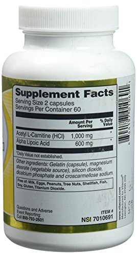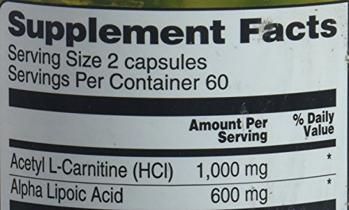 A combination formula featuring 2 well-known antioxidant nutrients. Antioxidants are substances that help protect healthy cells throughout the body from free radical damage.*Alpha lipoic acid (ALA) has been called a "universal antioxidant" because it is effective as an antioxidant in water-based substances such as blood while its reduced metabolite dihydrolipoic acid (DHLA) is effective in protecting fatty tissues and membranes.*Acetyl L-Carnitine is the acetyl ester of carnitine, an amino acid derivative, and is distributed throughout the central and peripheral nervous system. ALA and ALC are known as mitochondrial antioxidants that can provide anti-aging nutrition.* Mitochondria are the "power plants" of cells, providing the energy necessary to fuel a broad range of cellular processes.How does Vitacost Alpha Lipoic Acid & Acetyl L-Carnitine HCl support health?ALA may promote cardiovascular health by protecting against free radical damage*ALA and ALC can help to maintain blood pressure levels already within the normal range*ALC has been shown to reduce both physical and mental fatigue associated with aging*ALA enhances the antioxidant activity of vitamins C and E and coenzyme Q10ALC is a precursor to the important brain neurotransmitter acetylcholine, which contributes to the support of cognitive function and memory* About VitacostVitacost nutritional products are manufactured to high standards of quality, efficacy and safety. Each product meets or exceeds the standards and requirements set forth in the FDA's Code of Federal Regulation (21 CFR, 111) Current Good Manufacturing Practices(CGMP)*These statements have not been evaluated by the FDA. This product is not intended to diagnose, treat, cure or prevent any diseaseFeature