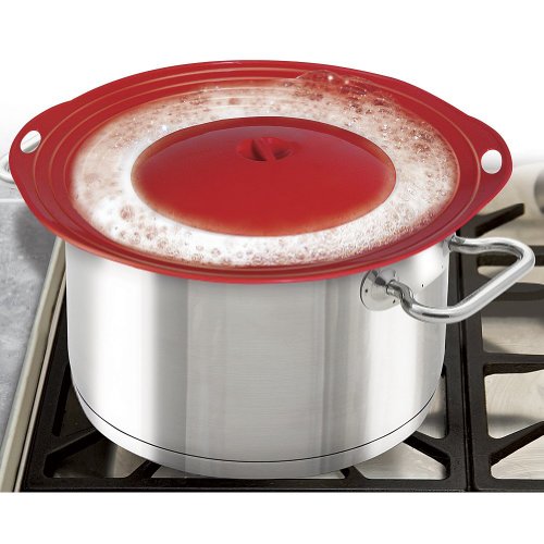 -. Feature : Unique silicone device prevents boil-overs. / Fits openings with a 6" to 10" diameter. / Heat resistant to 400 degrees. / Microwave and dishwasher safe. / Easy to use.
