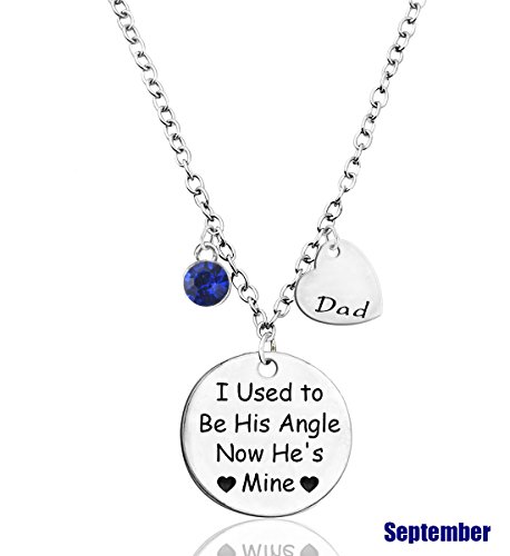 -. Binding : Jewelry -. Brand : TISDA -. Color : Crystal -. Department : Girls -. Feature : I used to be his angel, now he's mine. / This stainless steel necklace makes a sweet memorial gift for a girl . / "I used to be his angel, but now he's mine" on a 0.86" stainless steel disc ,Daddy is on a smaller stainless steel heart 0.5" / Chain length:about 20" / Including a beautiful gift box -. Label : TISDA -. Manufacturer : TISDA -. Model : 0263 -. MPN : 0263 -. PartNumber : 0263 -. ProductGroup : Jewelry -. ProductTypeName : FASHIONNECKLACEBRACELETANKLET -. Publisher : TISDA -. Studio : TISDA -. Title : TISDA 12 Colors Crystal pendant" I Used To Be His Angel Now He's Mine "Necklace Daddy,memorial necklace