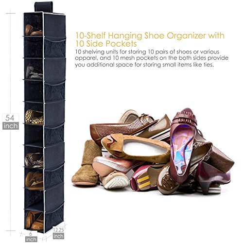 MAIDMAX HANGING SHOE ORGANIZER WITH 10 SIDE POCKETS AND 2 VELCROS, 10-SHELF, COLLAPSIBLE, BLACK