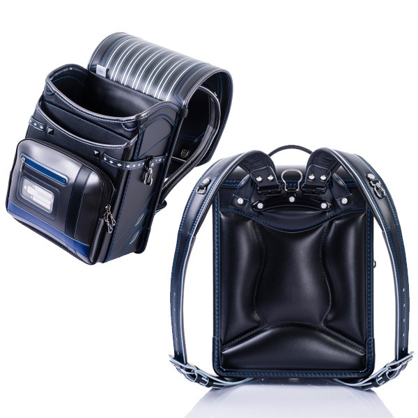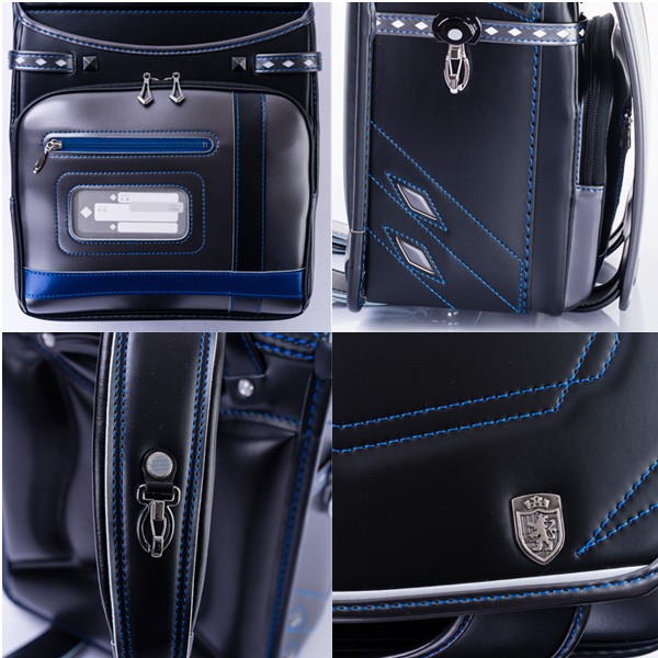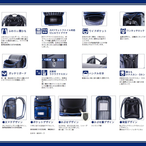 内装:黒無地、錠前:ワンタッチロック、補強:ガッチリガード、ポケット:ワイドポケット・内装総内張り・小ナスカン付、肩ベルト:ふわりぃ仕様・長尺・9穴・右(Dカン)・左(小ナスカン)、鋲:ライオン、ナスカン:反射材付、冠裏:ストライプ、反射材:冠下部・前締め・肩ベルト、固定型持ち手、カラー:ブラック/パールブラック