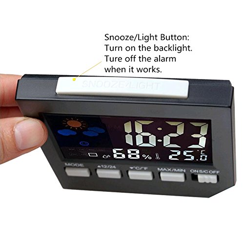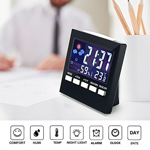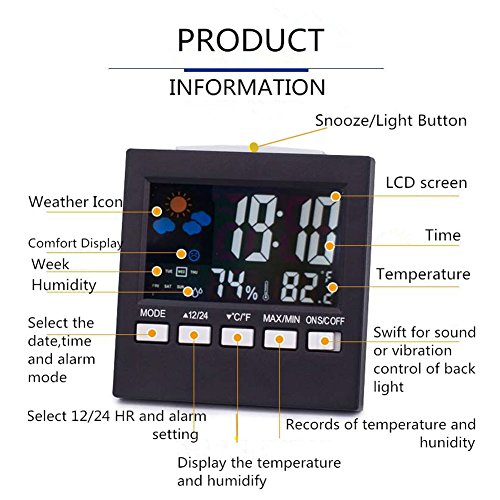 - MULTIPLE FUNCTIONAL HUMIDITY METERS : Work as hygrometer, thermometer, alarm clock, calendar, week, day, time, weather forecast, comfort icon ect.