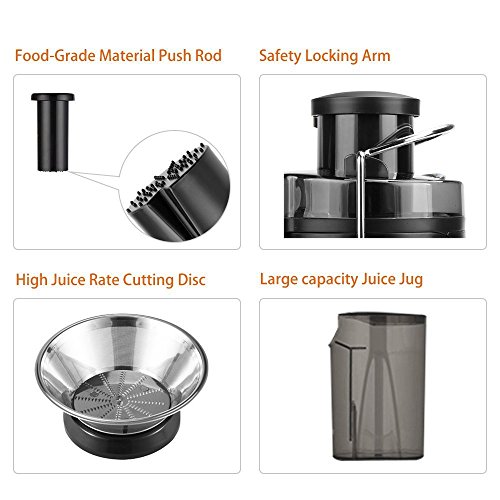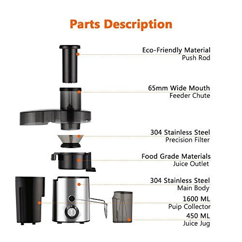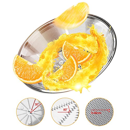 Anti-Drip Spout Design. 350w Motor with Stainless Steel Blade and Mesh Filter Basket, More Efficient Juicer to Extract up to 20% More Juice and 30% More Vitamins and Minerals. Lower Noise Compared With Other High Speed Centrifugal Juicer