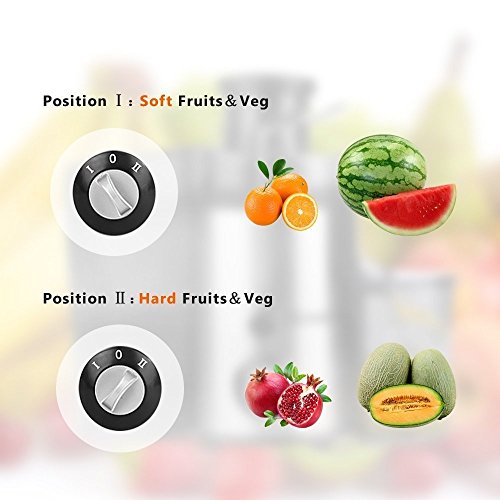 2 Speed Modes to Extract The Most Juice From Soft and Hard Fruits/Vegetables. "1" Low Speed(12000RPM-15000RPM) for Softer Fruits Like Oranges, Apples, Grapes, Melons and Tomatoes; "2" Fast Speed (15000RPM-18000RPM) for Harder Fruits Like Carrot, Celery Stalks, Beets, Ginger and Beans