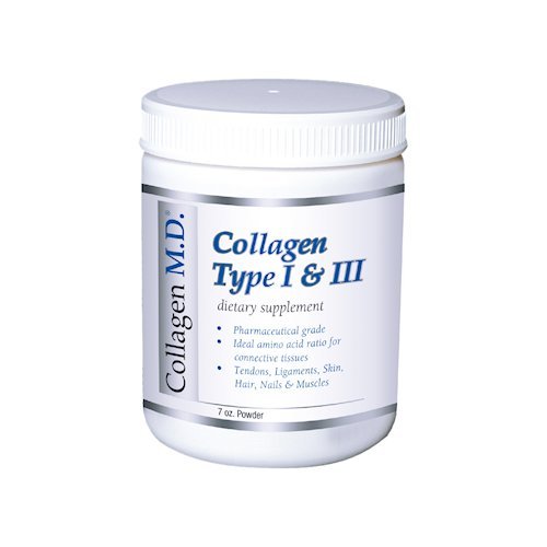 Collagen Type I & III powder 7 oz Dietary Supplement Collagen is plex structural protein that maintains strength and y of skin, ligaments, bones, joints, muscles, tendons, gums, teeth, eyes, blood vessels, nails, and hair. Collagen M.D. Collagen Type I & III is bovine collagen peptides, sourced from high y USDA approved sources. These peptides provide major building materials for growth and maintenance of a healthy body. Collagen M.D. Collagen Type I & III is enzymatically processed 's amino acid form with a very low molecular weight, which can be utilized 100% by the body.* Collagen M.D. Collagen Type I & III powder is neutral in taste and specifically formulated in an easy to take powdered form. It works synergistically with Collagen M.D. Hyaluronic Acid capsules and Vitamin C. It is mended be mixed with orange juice because 's high Vitamin C content or taken along with a Vitamin C supplement. Always consult with your physician before taking this and other supplements.* Suggested Use: As a dietary supplement dissolve one scoop (included inside) of Collagen M.D. Collagen Type I & III with one ounce of water or orange juice then add 6-8 ounces more liquid, and stir vigorously or use a blender for best results. For optimum ional s, drink as suggested on an empty stomach and 30 minutes before eating or before taking any protein products. Supplement Facts: Serving size: 1 sccop (6.6 grams) Servings per container: 30 Amount per serving: Calories 22 Collagen Types I & III 6.6 g Total Carbohydrates 0 g Fat 0 g Ingredients: Collagen Type I & III protein peptides derived from pharmaceutical food grade bovine collagen. Note: Collagen M.D. Collagen Type I & III is not plete protein and should not be used to replace dietary protein. Contains no sucrose, starch, corn, yeast, wheat, dairy, soy, preservatives, or gluten. Allergy warning: May contain e residues. Keep out of reach of children. Keep in a cool dry place. do not expose to heat or moisture. This product is sold by weFeature