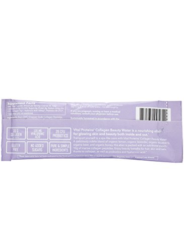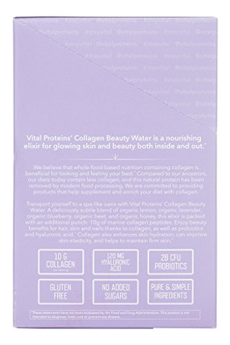 Vital Proteins' Collagen Beauty Water is a nourishing elixir for glowing skin and beauty both inside and out. We believe that whole-food-based nutrition containing collagen is beneficial for looking and feeling your best. Compared to our ancestors, our diets today contain less collagen, and this natural protein has been removed by modern food processing. We are committed to providing products that help supplement and enrich your diet with collagen. Transport to a spa-like oasis with our Collagen Beauty Water: a deliciously subtle blend of collagen, hyaluronic acid, probiotics, organic lemon, organic lavender, organic blueberry and organic beet. This elixir is packed with an additional punch: 10g of marine collagen peptides. Enjoy beauty benefits for hair, skin and nails thanks to collagen, as well as probiotics and hyaluronic acid. Collagen also enhances skin hydration, can improve skin elasticity, and helps to maintain firm skin.Feature