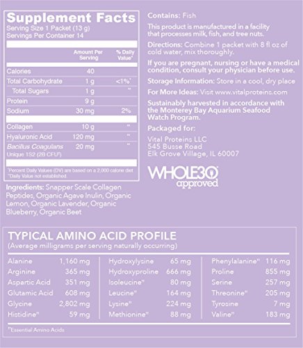 Natural elixir made with collagen, hyaluronic acid, probiotics, organic lemon, organic lavender, organic blueberry and organic beet; has a light lavender lemon flavor