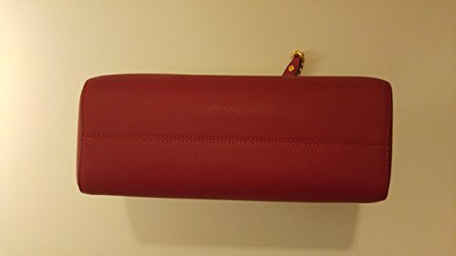 Beautiful saffiano leather shoulder tote in luggage Red Dual leather handles in navy with gold tone chain link detail with 9½ drop Slip pockets on either exterior side Flat bottomFeature