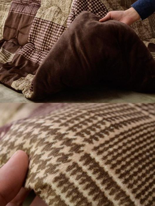 チェック柄のこたつ布団です。生地にふわふわの手触りが特徴の柔らかい素材を使用しています。 |