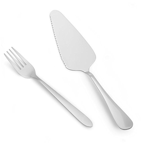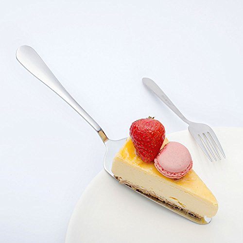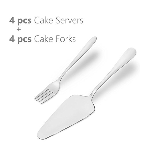 Product Description Including: 4 pieces 9 inch cake servers and 4 pieces 6 inch cake/dinner fork. Made of mirror polished stainless steel, durable, sturdy and easy to clean. Features a serrated edge, use to cut and serve pieces of cake,pie,pizza,cheese . Fits for: holiday, party, housewarming, birthday, wedding, awards commemorate, the anniversary celebrations, the opening ceremony. Comfortable handles are easy to grip and dishwasher safe for easy cleaning. 0
