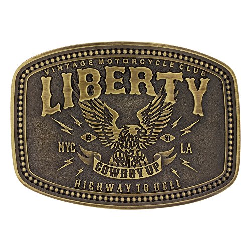A heritage brass looking rounded rectangular Attitude buckle. An officially licensed Cowboy Up vintage looking buckle with 'Liberty' spanning across the top over an protective eagle figure with a waving flag underneath with the words 'Cowboy Up' on it and 'Highway to Hell' in a small script underneath. A simple edge of brass colored microbeads flow along the inner border with a thin line of smooth trim finishing it off. Standard 1.5 inch belt swivel.