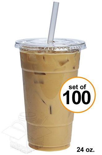 - 100 Sets 24 oz. Plastic Clear Cups with flat Lids is Great for cold drinks like Iced Coffee, Smoothies, Bubble/Buba Tea, Milkshakes & Frozen Cocktails, water, sodas, and juices.