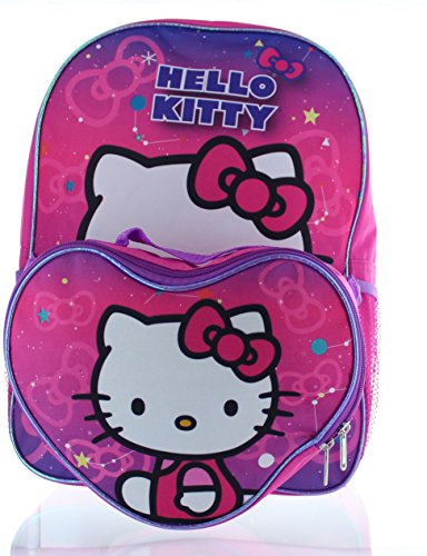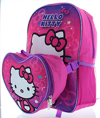 -. Brand : Sanrio -. Color : Pink -. Department : unisex-adult -. EAN : 0727379055140 -. Feature : Officially licensed Hello Kitty kids back pack with lunch bag / Large size backpack dimensions approx 15"H x 11"W x 5"D and lunch bag dimensions approx 10"H x 8"W x 3"D / Features zipper closure, side pockets, adjustable shoulder straps and straps to attach lunch bag to backpack / Pink and Purple in color / Suitable for childrens ages 3 and up -. Model : 5600217 -. MPN : LYSB0118DMEW4-TOYS -. PackageQuantity : 1 -. PartNumber : LYSB0118DMEW4-TOYS -. ProductGroup : Apparel -. ProductTypeName : LAGE -. Size : One Size -. Title : Hello Kitty 15" Backpack with Lunch Bag -. UPC : 727379055140
