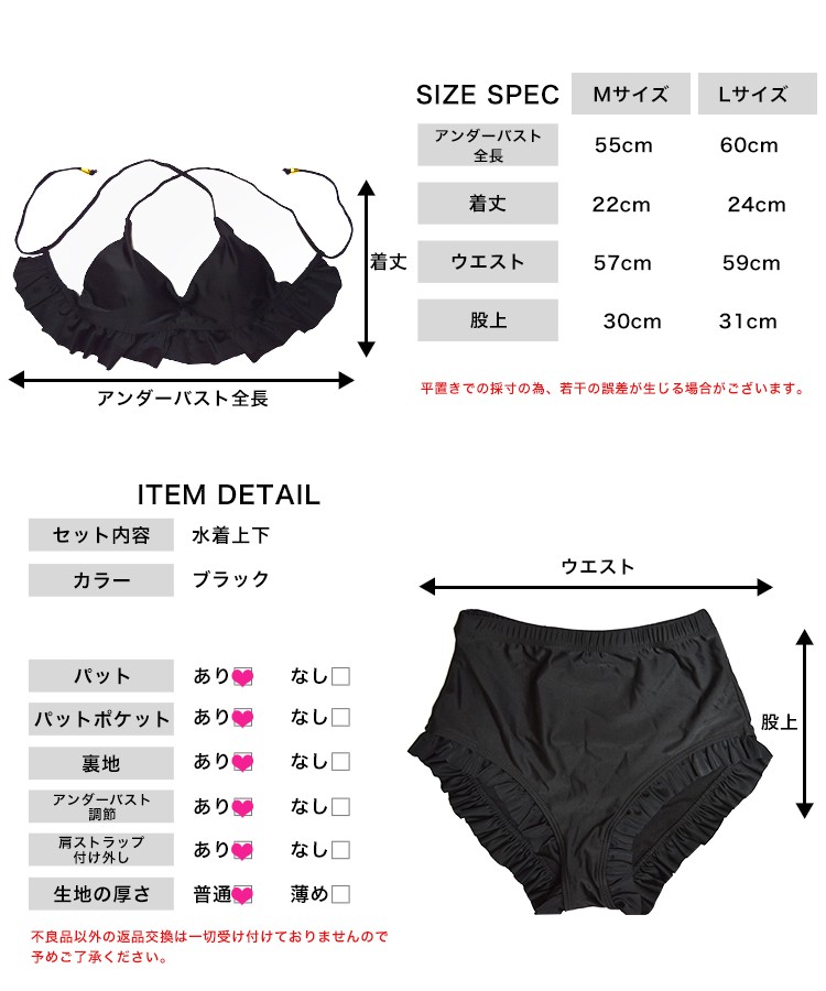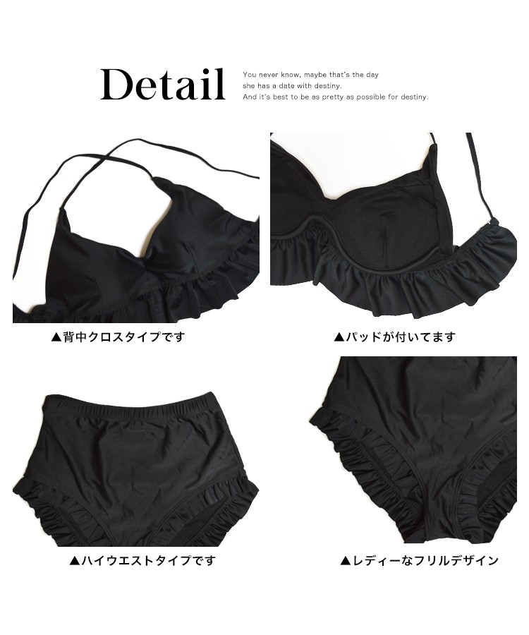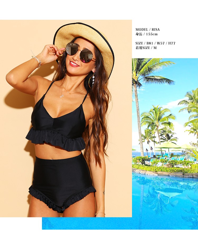 | 商品特徴 | LAVIA(ラヴィア)から新作のプチプラ水着が入荷しました。大振りのフリルが印象的で大人可愛く着こなせます。トップはワイヤー入りなのでバストアップ効果も期待できます。ハイウェストショーツで気になる体系カバーもばっちりです。モノトーンカラーで流行りを関係なく長く愛用していただけるアイテムです。 |