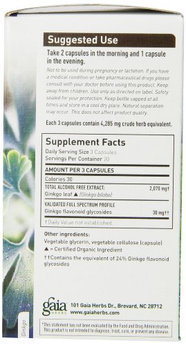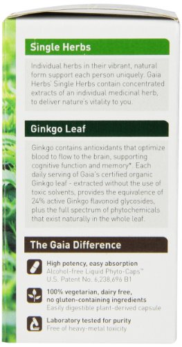 Gaia Herbs Single Herbs Ginkgo Leaf promotes healthy circulation and memory. Ginkgo contains antioxidants that relax the blood vessel walls. This allows more blood to flow to the brain, supporting cognitive function and memory. Each serving of Gaia's certified organic Ginkgo leaf in Liquid Phyto-Caps provides a guaranteed 24% active Ginkgo flavonoid glycosides, plus the full spectrum of phytochemicals that exist naturally in the whole leaf. Individual herbs in their vibrant, natural form support each person uniquely. Gaia Herbs' Single Herbs contain concentrated extracts of an individual medicinal herb, to deliver Nature's vitality to you.Feature