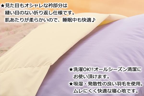 | 吸湿・発散性の良い羽毛は蒸れにくく快適!!衿もとに縫い目がない折り返し仕様なので肌あたりがやわらかです。 |