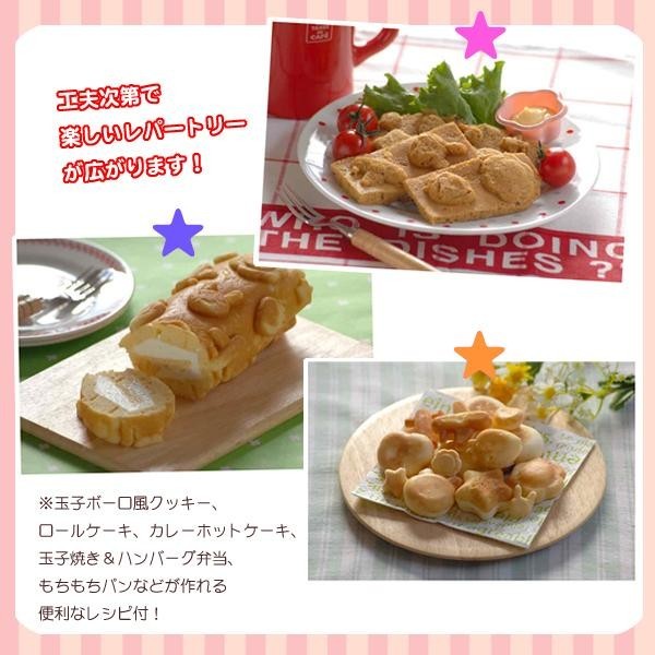ハート、ほし、はな、いちご、くま、うさぎ、ひこうきの大・小の型がちりばめられた、かわいい焼き生地がカンタンに作れます。 |