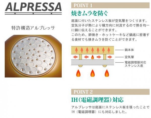 | 素材・材質 | 本体:アルミニウム合金(内面:ふっ素樹脂塗膜加工) 貼底:ステンレス板(厚さ:0.7mm) 蓋:鉄(シリコン塗装仕上) ハンドル・蓋つまみ:フェノール樹脂 |